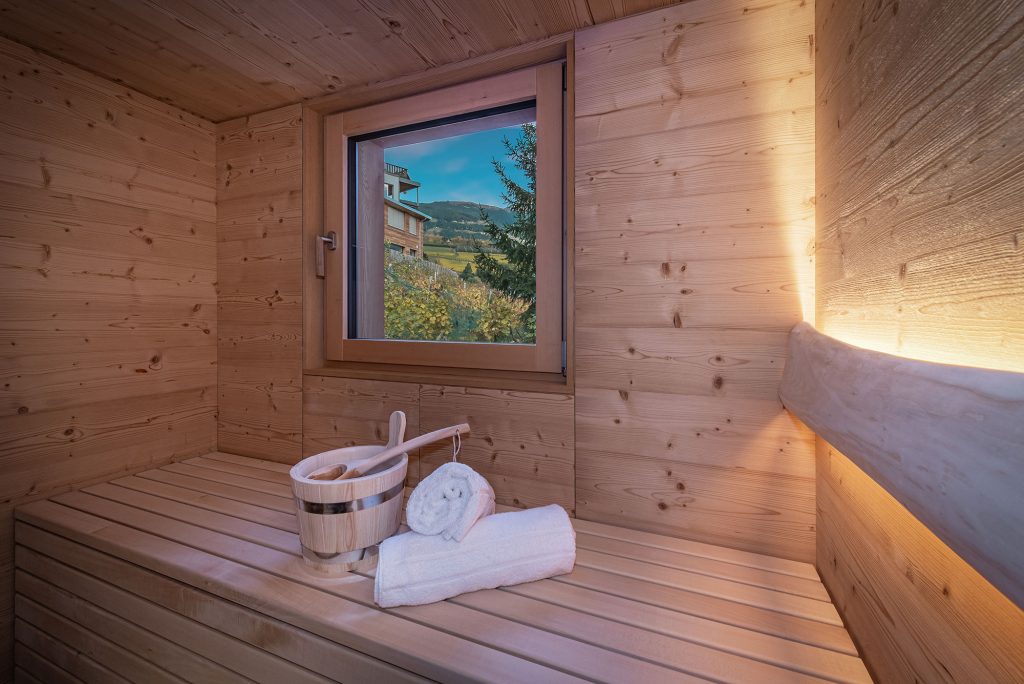 Wohlfühlzeit nach einem aktiven Tag: Die Wärme in der Sauna entspannt Körper und Geist. Beim Saunagang genießt du einen wunderbaren Blick auf die Weinberge.